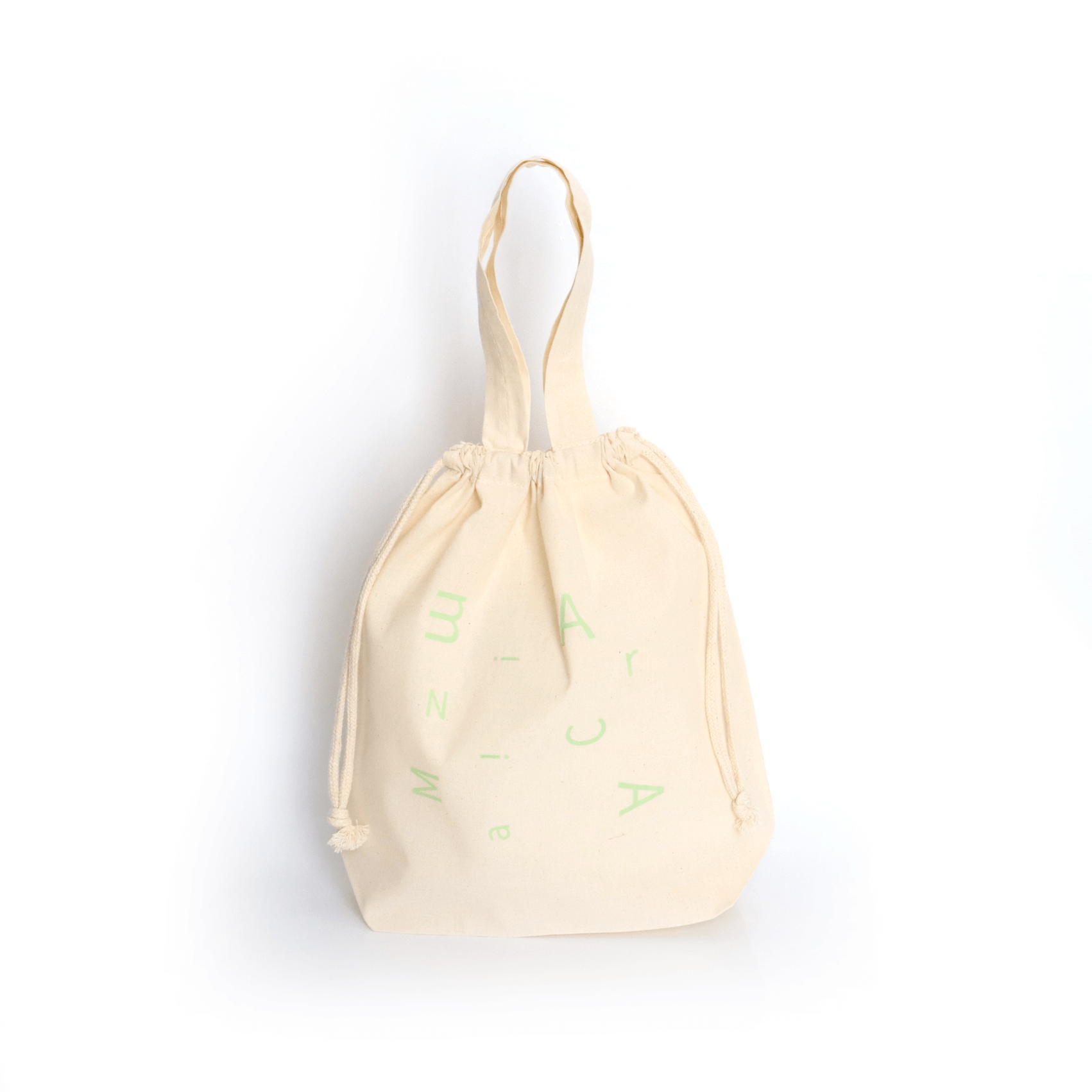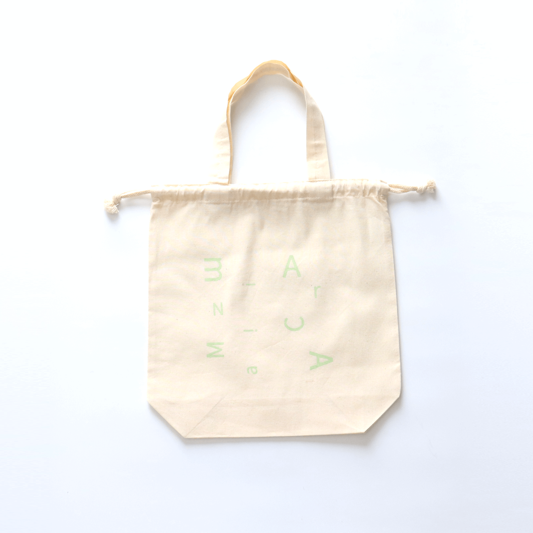 minima arcaのロゴをランダムに配置したシンプルで遊び心のあるデザインの巾着バッグ。