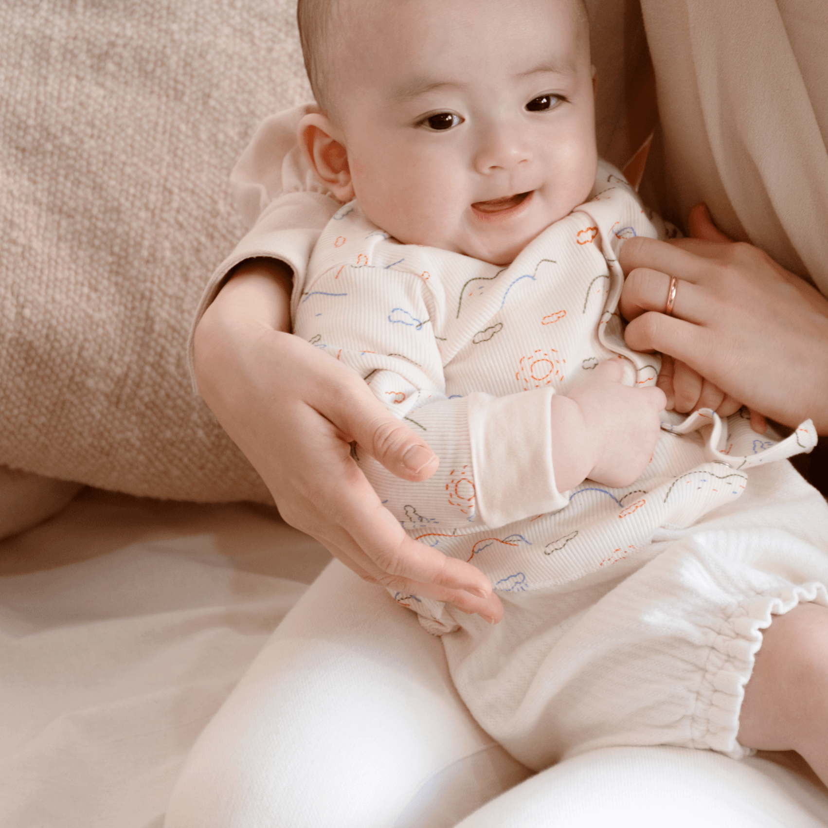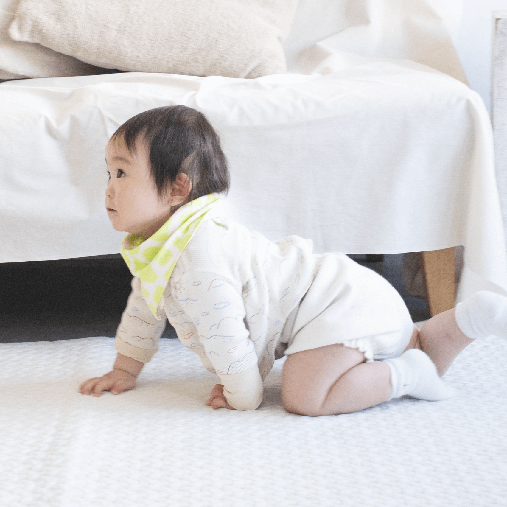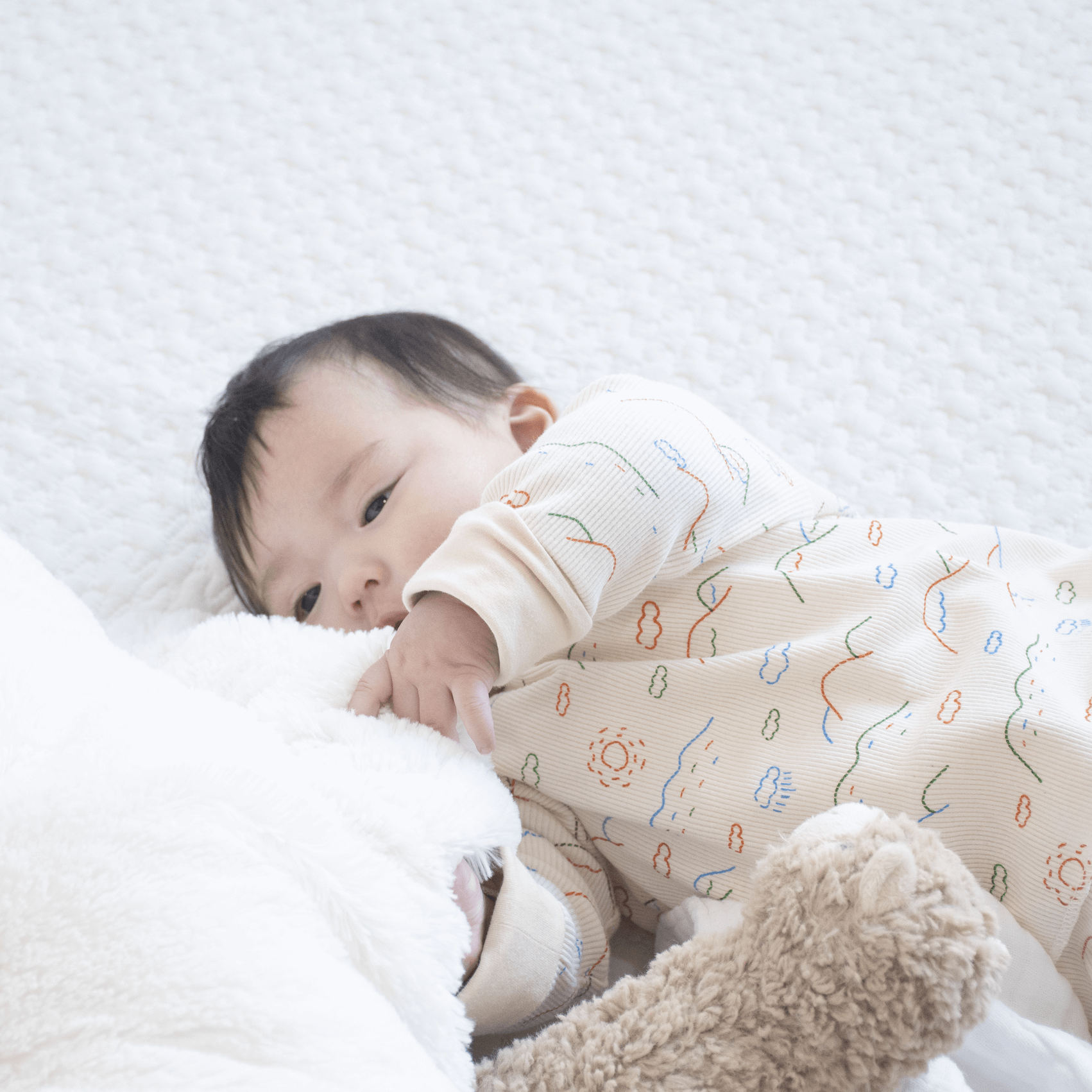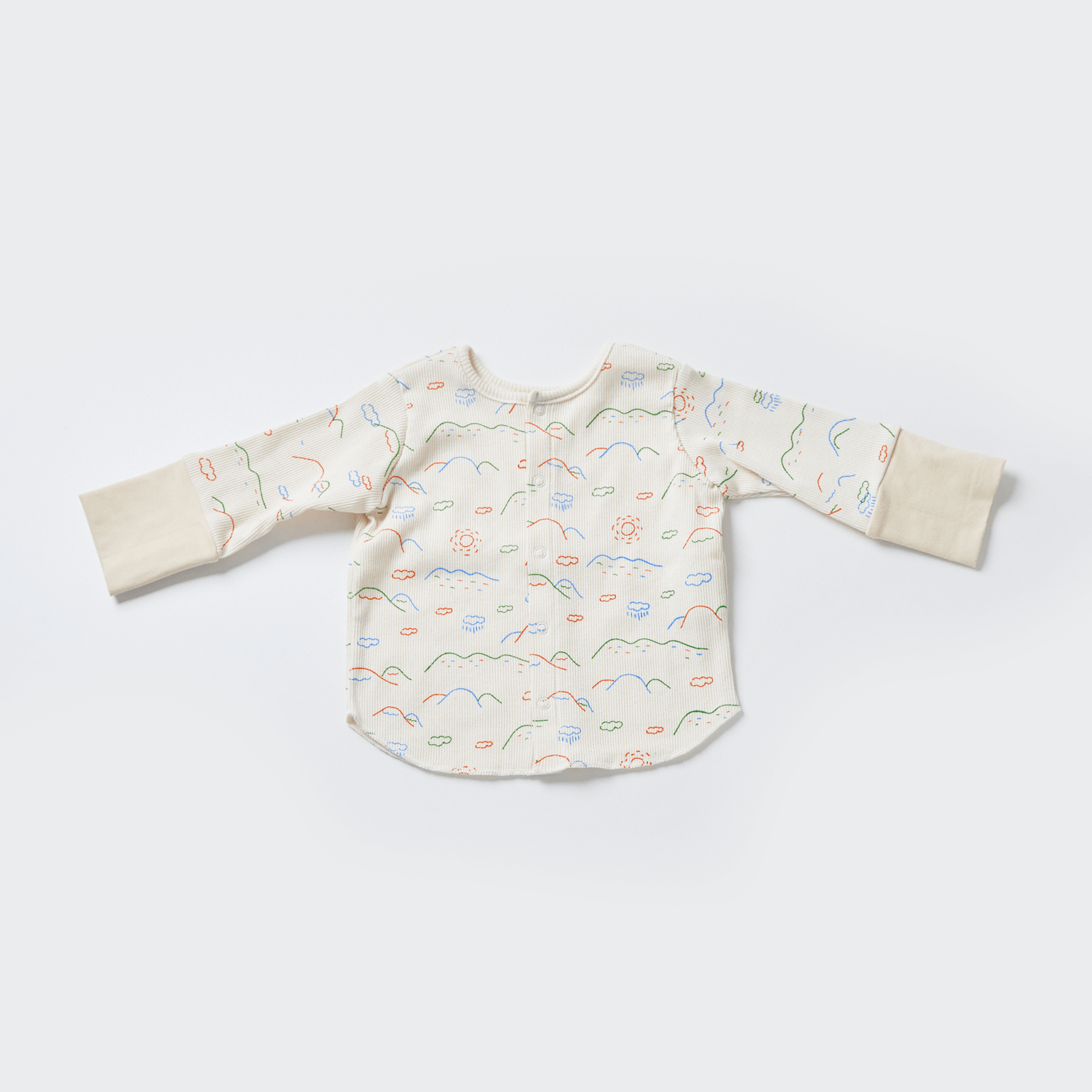 袖口を少し長めにとったデザインは赤ちゃんの成長に合わせ折り返して調整でき、0~1歳頃まで長くご着用いただけます。