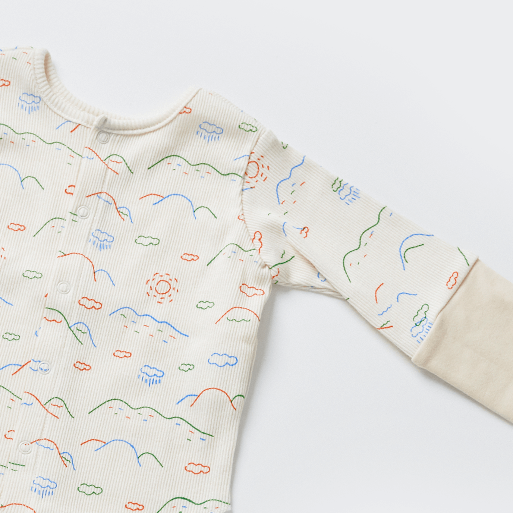 カラフルな山々と太陽や雨を降らす雲のイラストが目を引く前後2WAYカーディガン