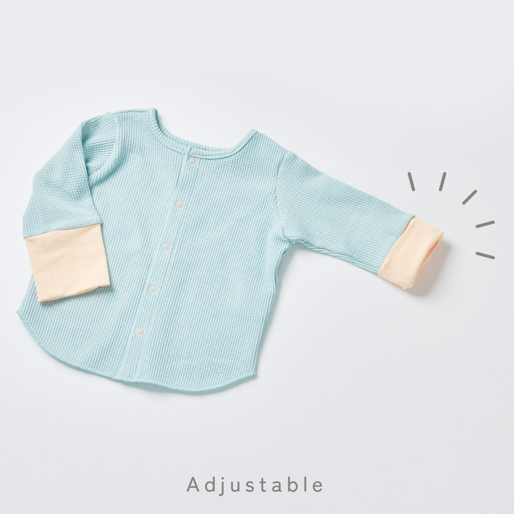 袖口を少し長めにとったデザインは赤ちゃんの成長に合わせ折り返して調整でき、0~1歳頃まで長くご着用いただけます。