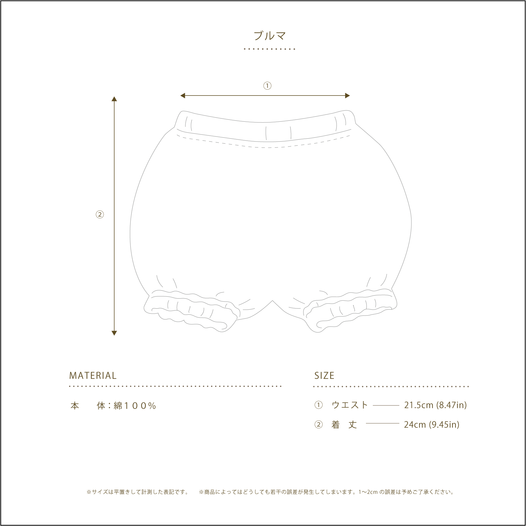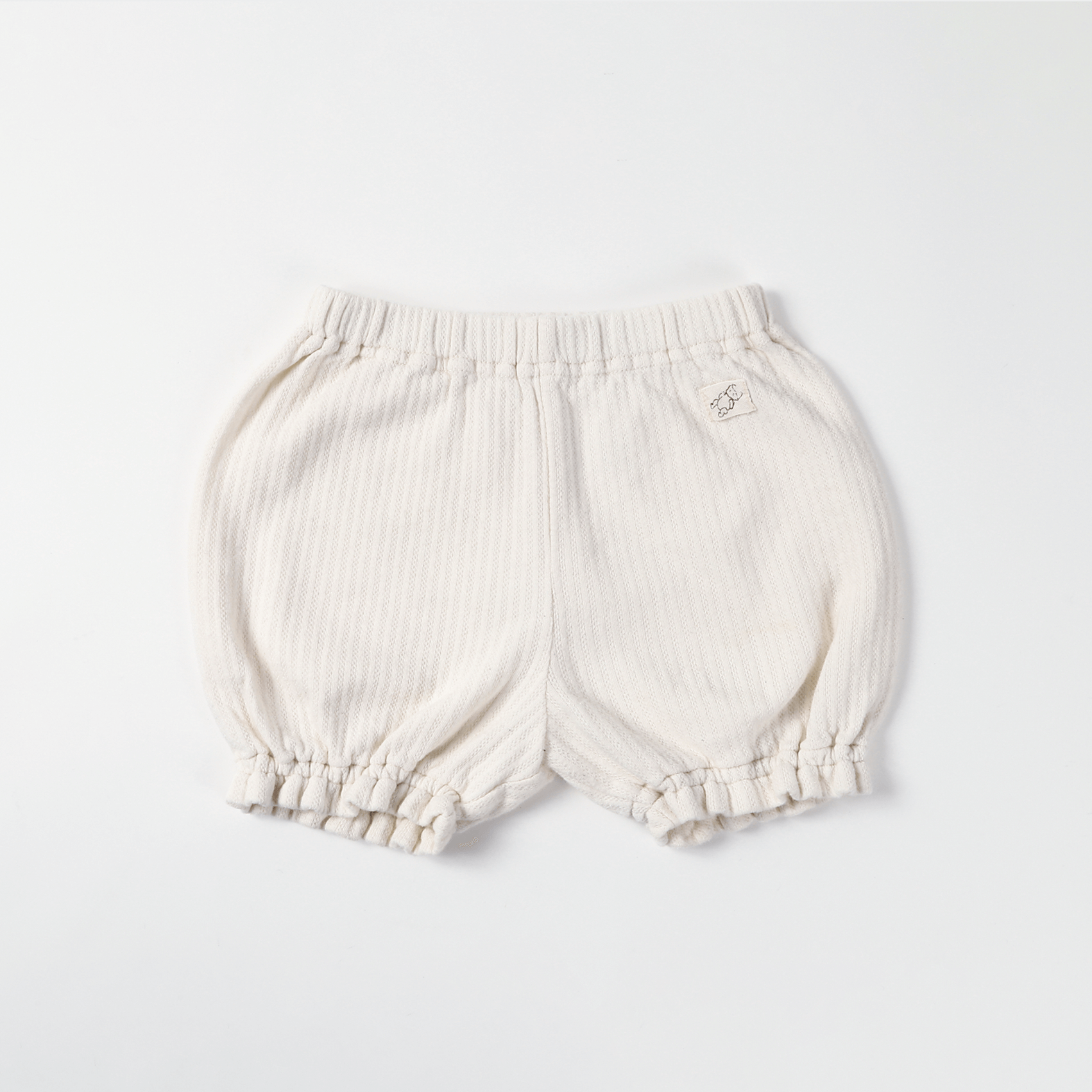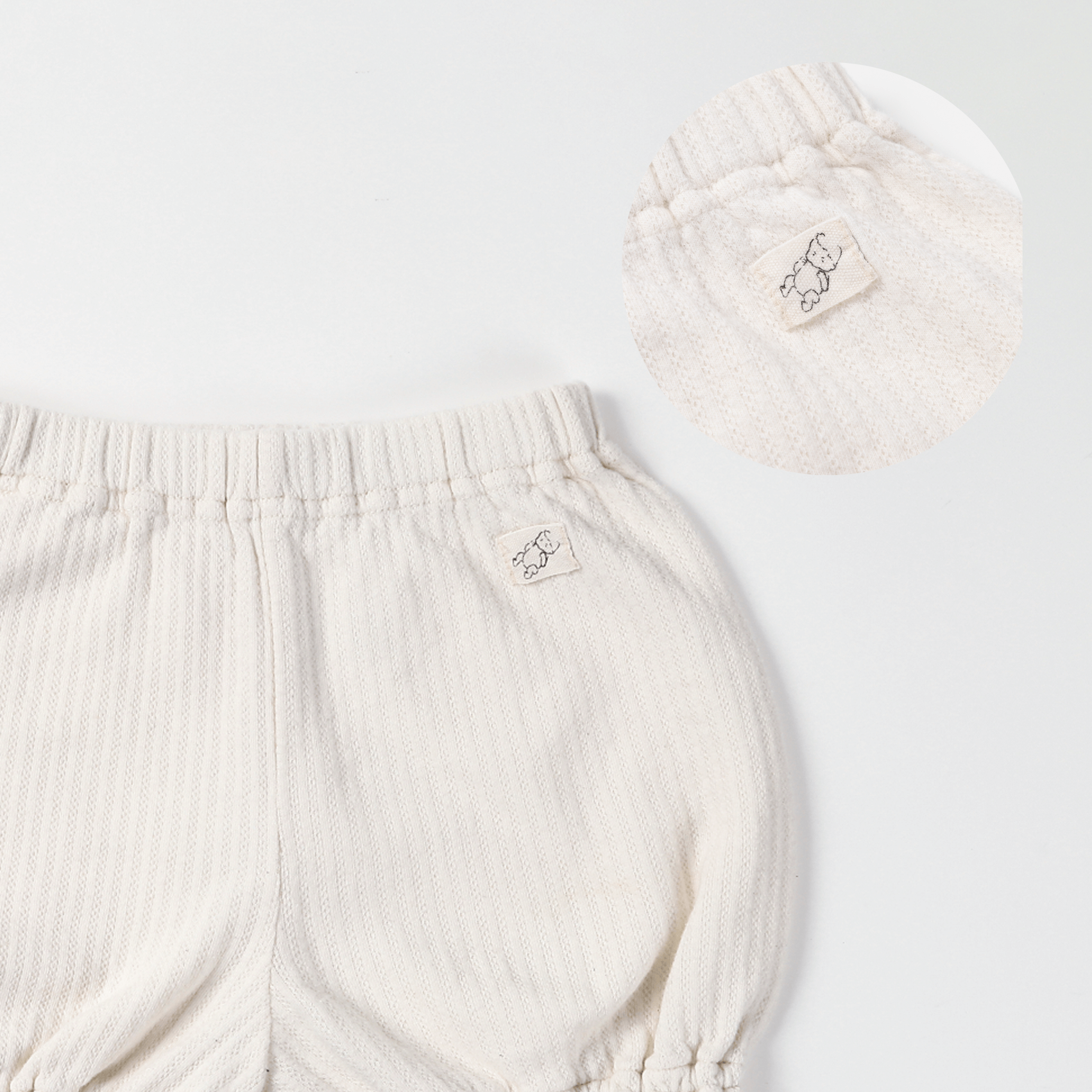 ウエスト部分のプランドロゴがワンポイントのシンプルなデザイン。太もも部分のゴムも締め付け感がなく履き心地も抜群です。ワンサイズで0~1歳頃まで長くご着用いただけます。