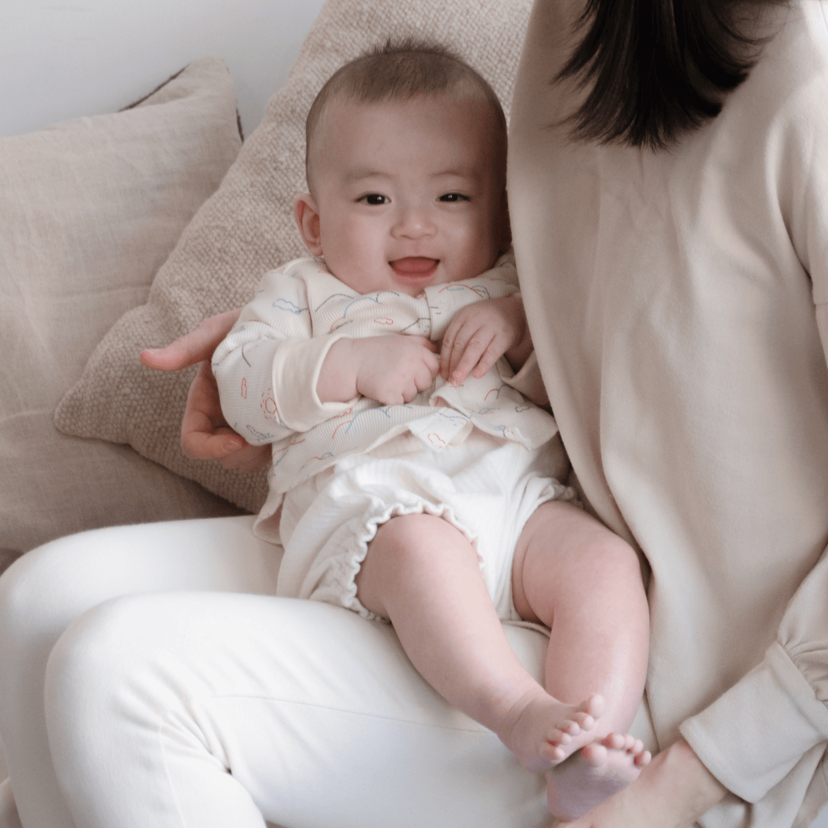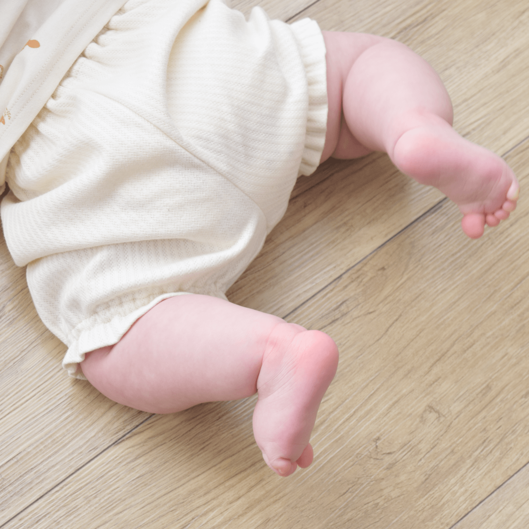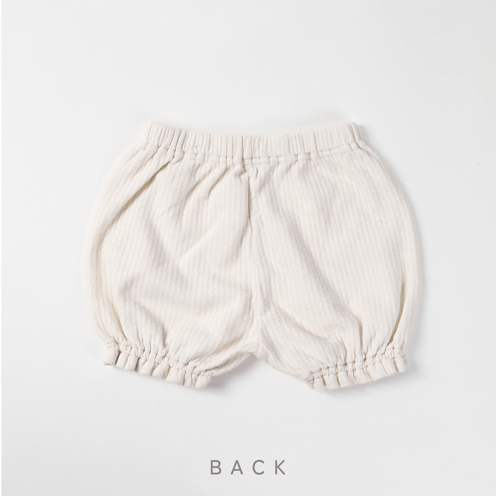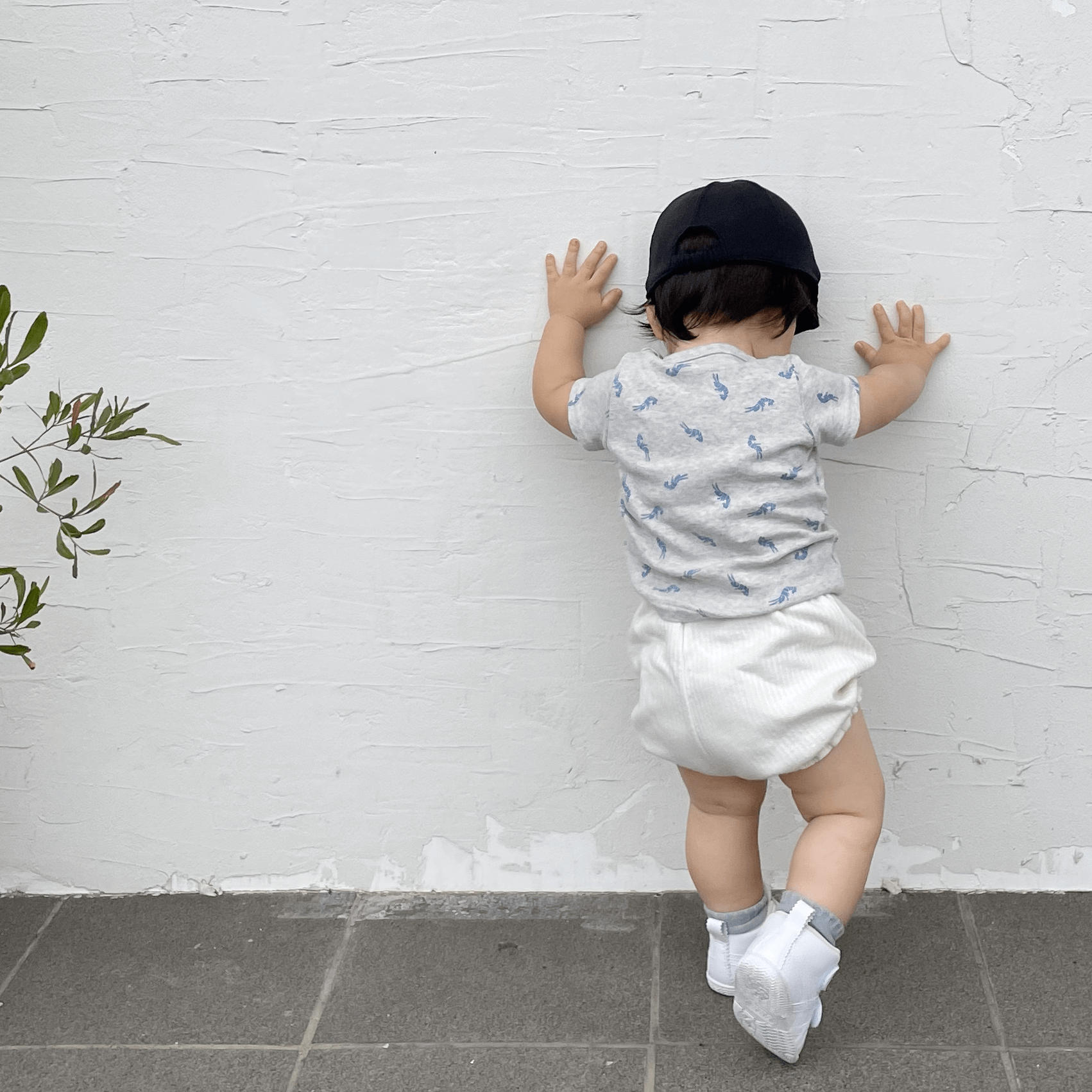 ウエスト部分のプランドロゴがワンポイントのシンプルなデザイン。太もも部分のゴムも締め付け感がなく履き心地も抜群です。ワンサイズで0~1歳頃まで長くご着用いただけます。