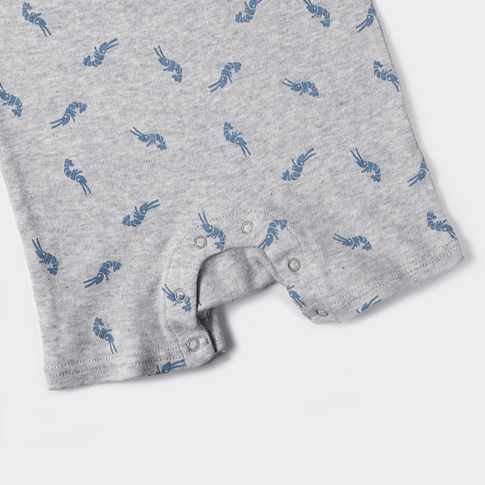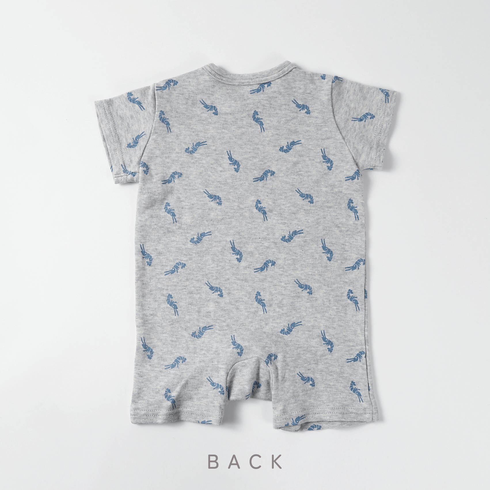 めずらしいエビをモチーフにしたオリジナルプリント。ニュアンスカラーと踊っているようなエビ柄が他にはないデザインです。肩のスナップで衿元が大きく開くのでお着替えもしやすく、 股部分のスナップでオムツ替えも簡単にできます。