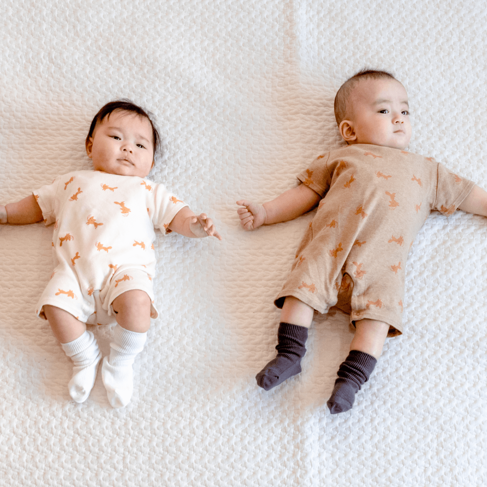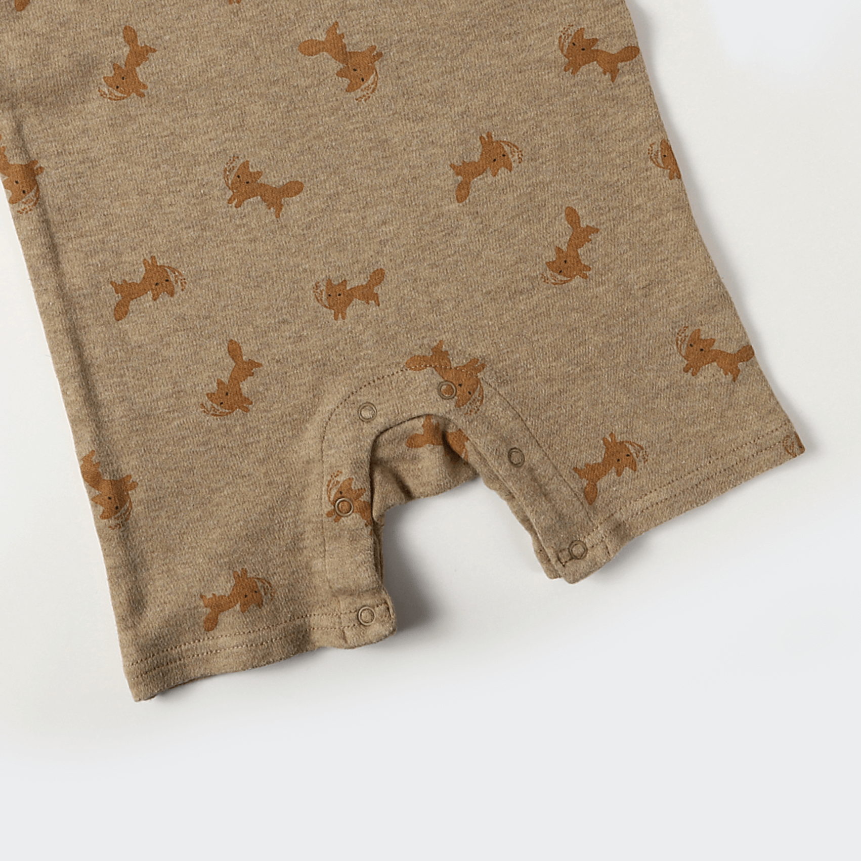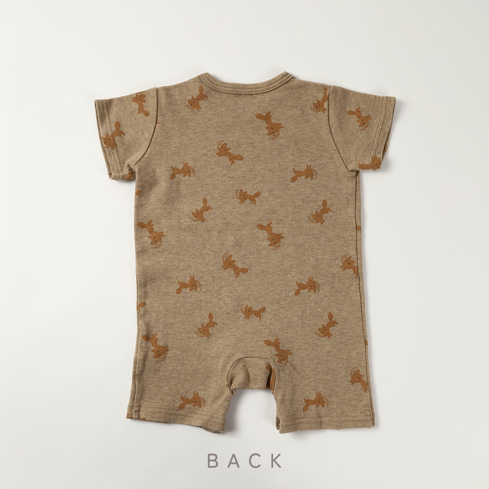 アンニュイな表情のキツネさんがどこかホッとするオリジナルプリント。肩のスナップで衿元が大きく開くのでお着替えもしやすく、 股部分のスナップでオムツ替えも簡単にできます。