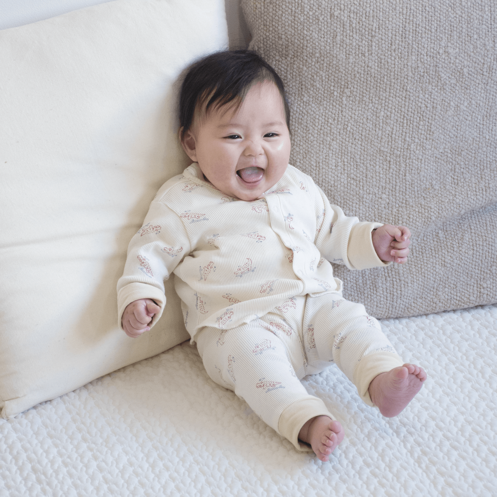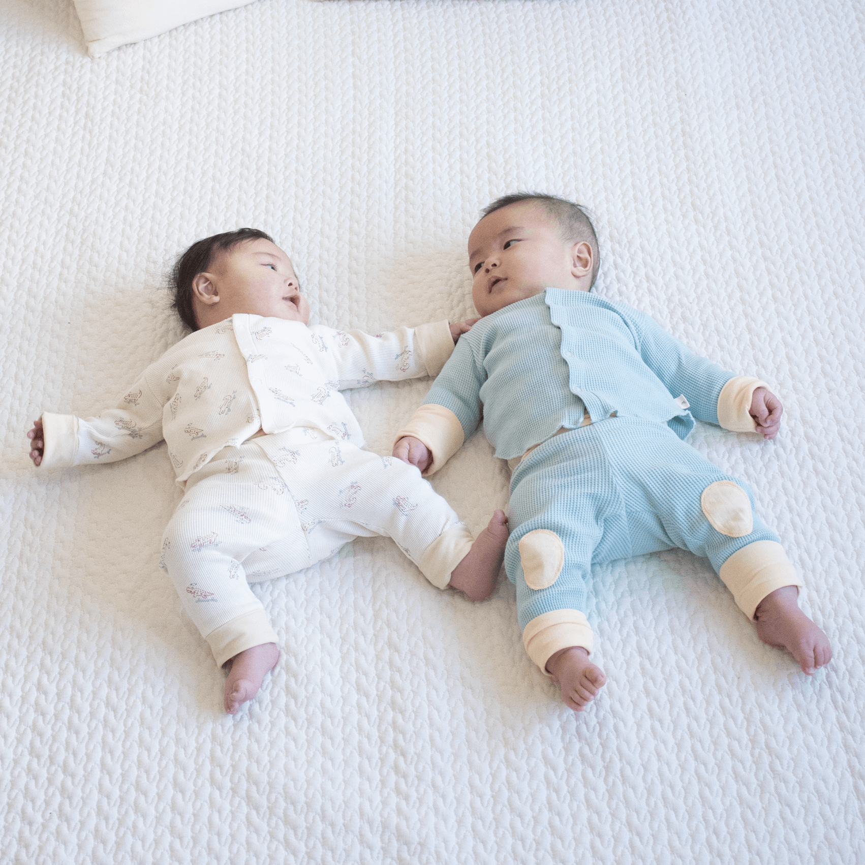 ウェスト部分の幅も少し広めにとることで、サイズの調整だけでなく、伸ばして腹巻きのように使用することでお腹を冷えから守ります。裾部分を少し長めにとったデザインは赤ちゃんの成長に合わせて折り返して調整ができ、0~1歳頃まで長くご着用いただけます。