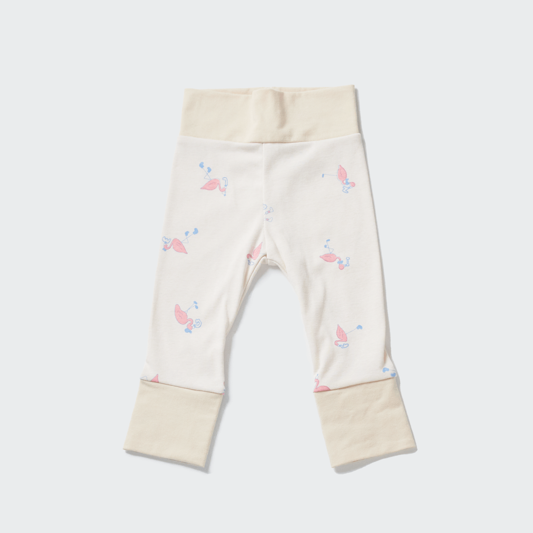 ウェスト部分の幅も少し広めにとることで、サイズの調整だけでなく、伸ばして腹巻きのように使用することでお腹を冷えから守ります。裾部分を少し長めにとったデザインは赤ちゃんの成長に合わせて折り返して調整ができ、0~1歳頃まで長くご着用いただけます。