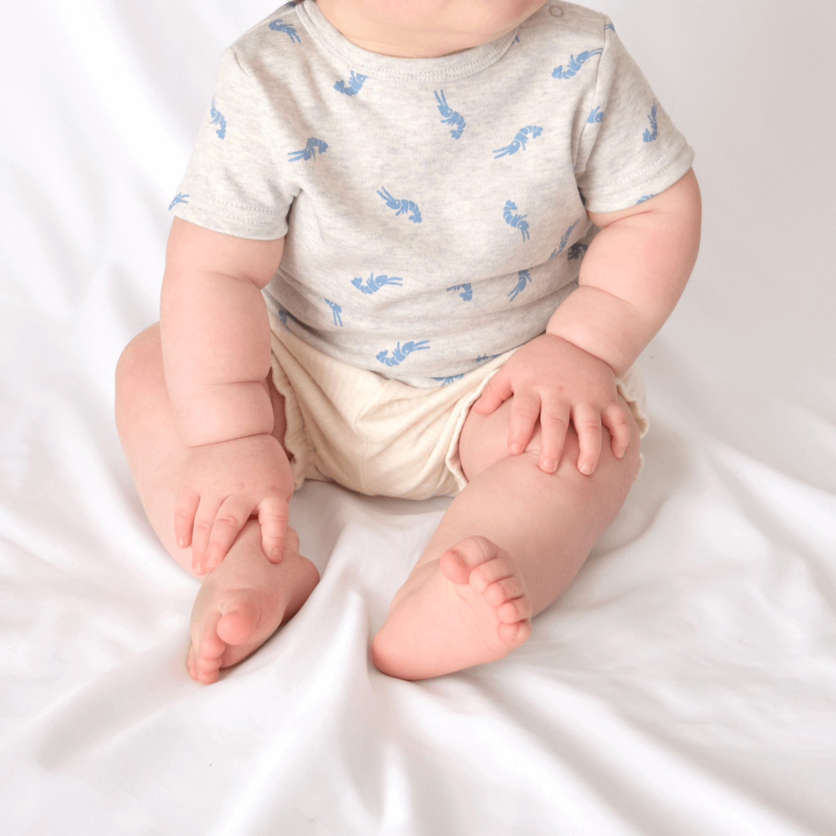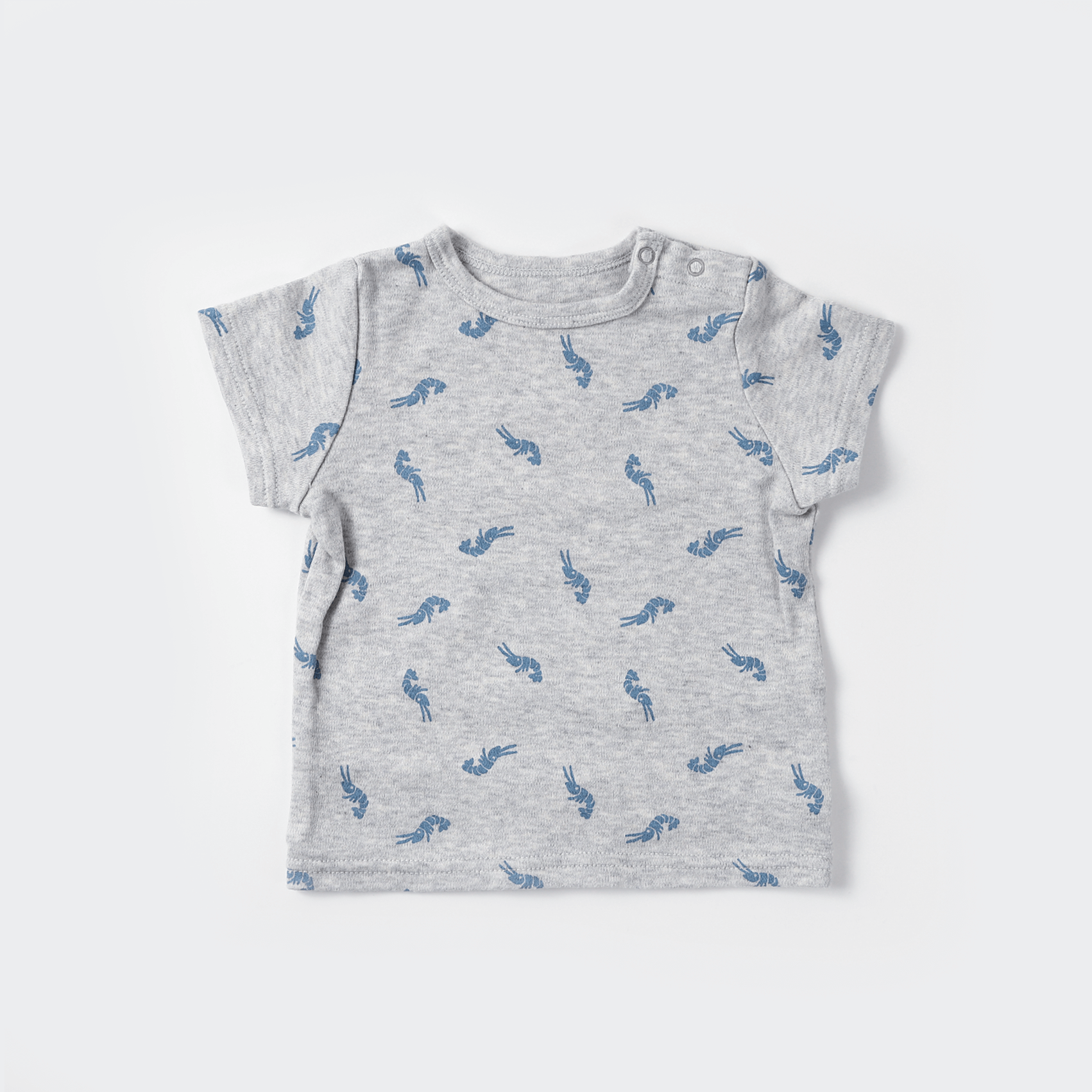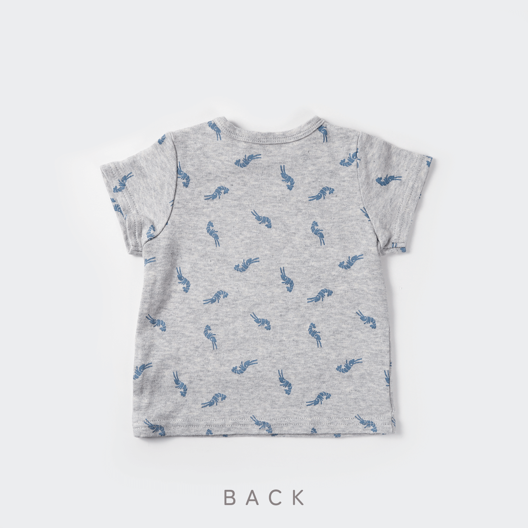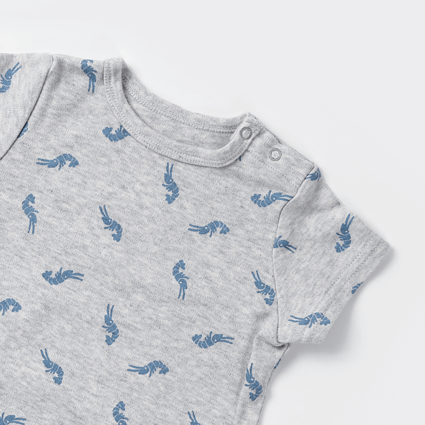 めずらしいエビをモチーフにしたオリジナルプリント。ニュアンスカラーと踊っているようなエビ柄が他にはないデザインです。肩のスナップで衿元が大きく開き、お着替えも簡単です。