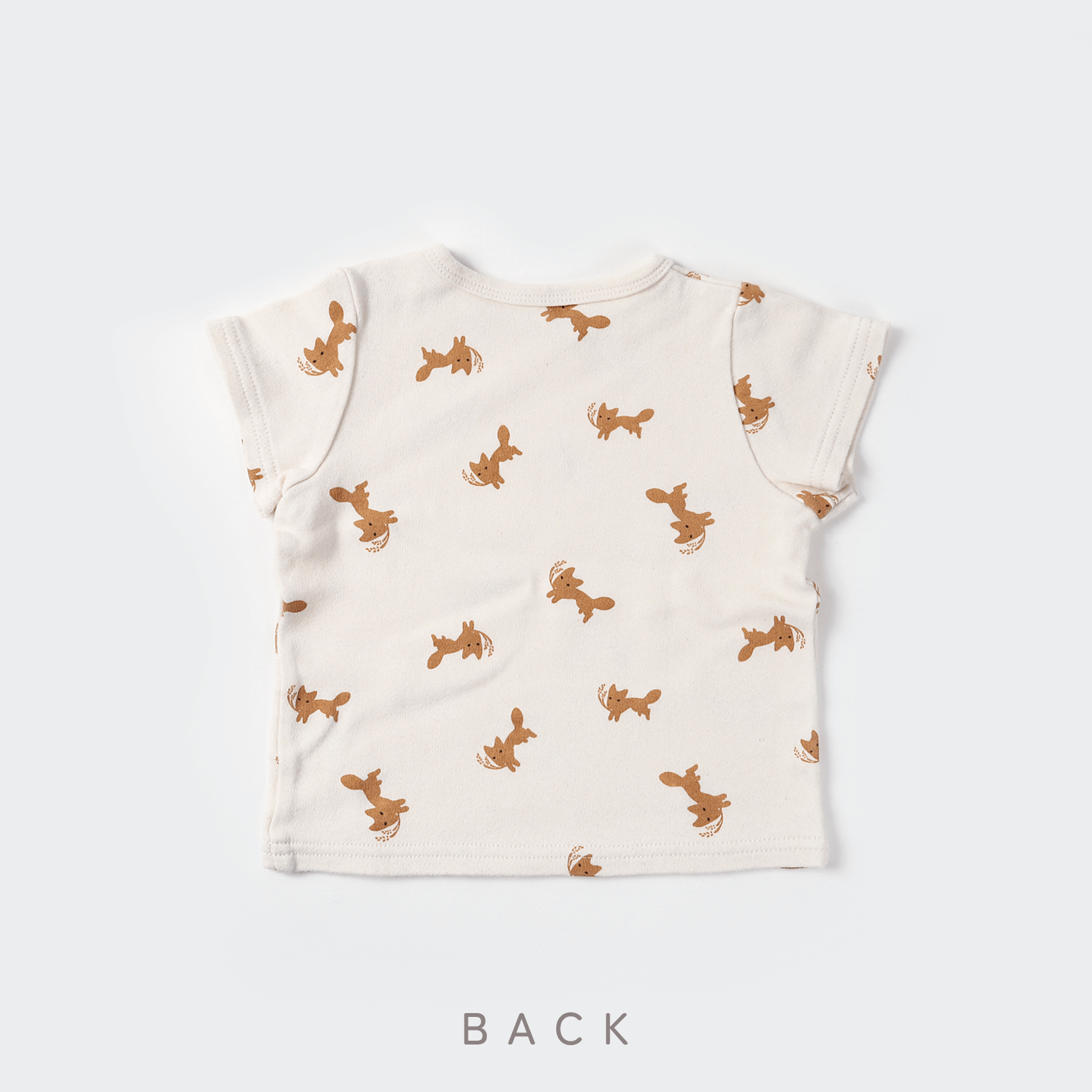 アンニュイな表情のキツネさんがどこかホッとするオリジナルプリント。肩のスナップで衿元が大きく開きお着替えも簡単です。