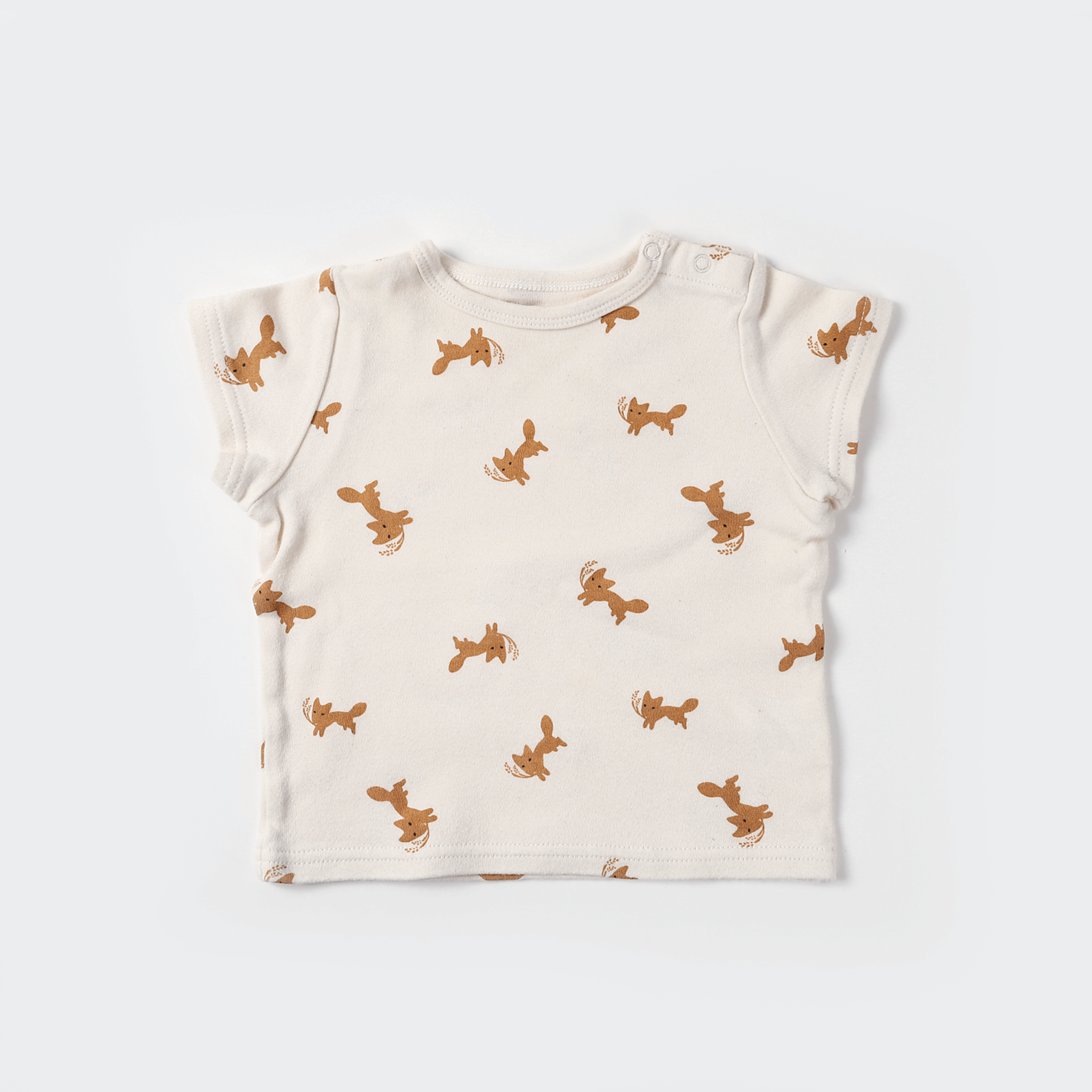 麦を咥えたほのぼのとした表情のキツネ柄のTシャツ