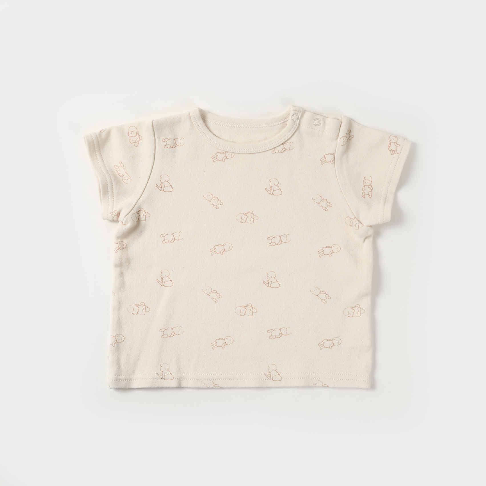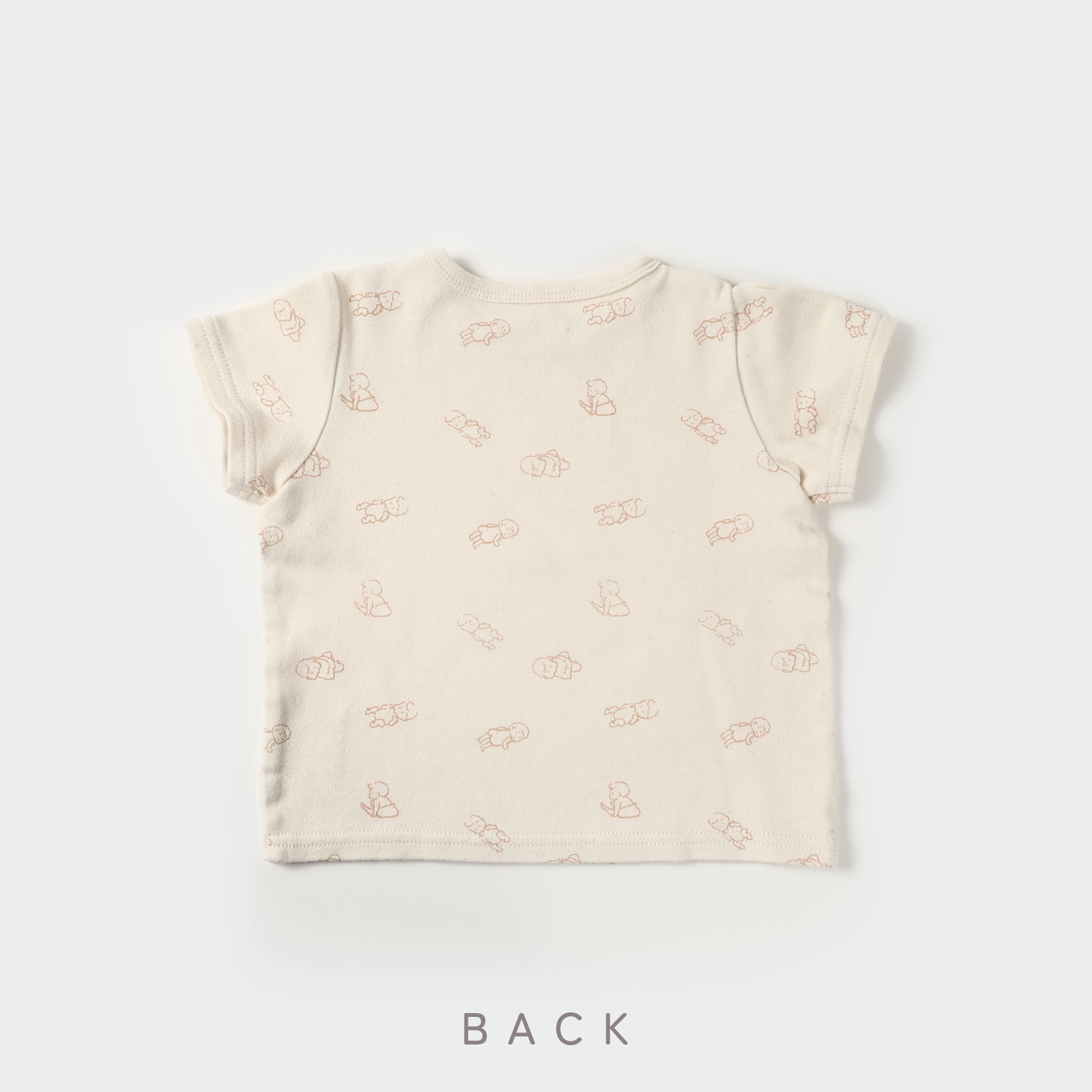 ブランドアイコンの赤ちゃんプリント。肩のスナップで衿元が大きく開き、お着替えも簡単です。