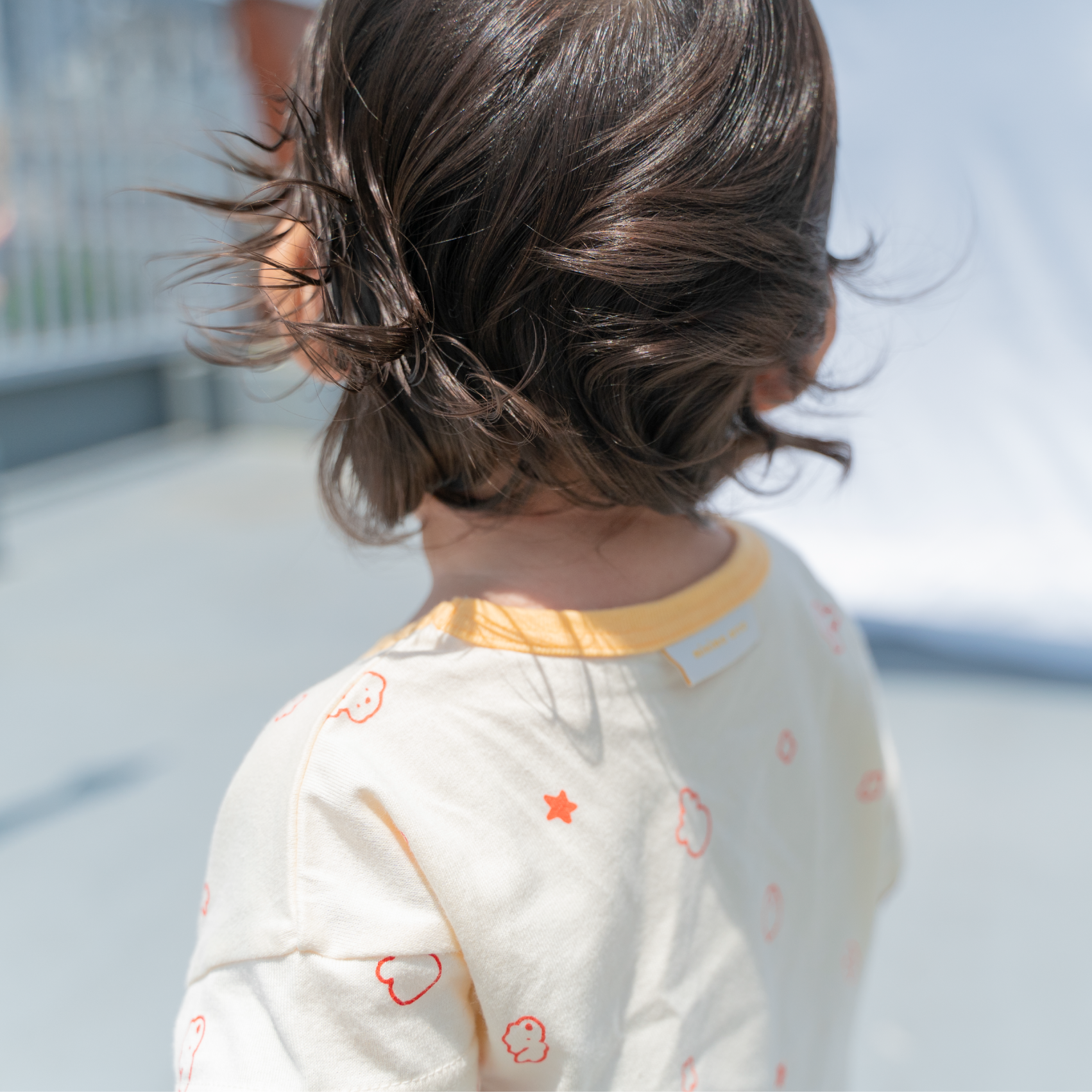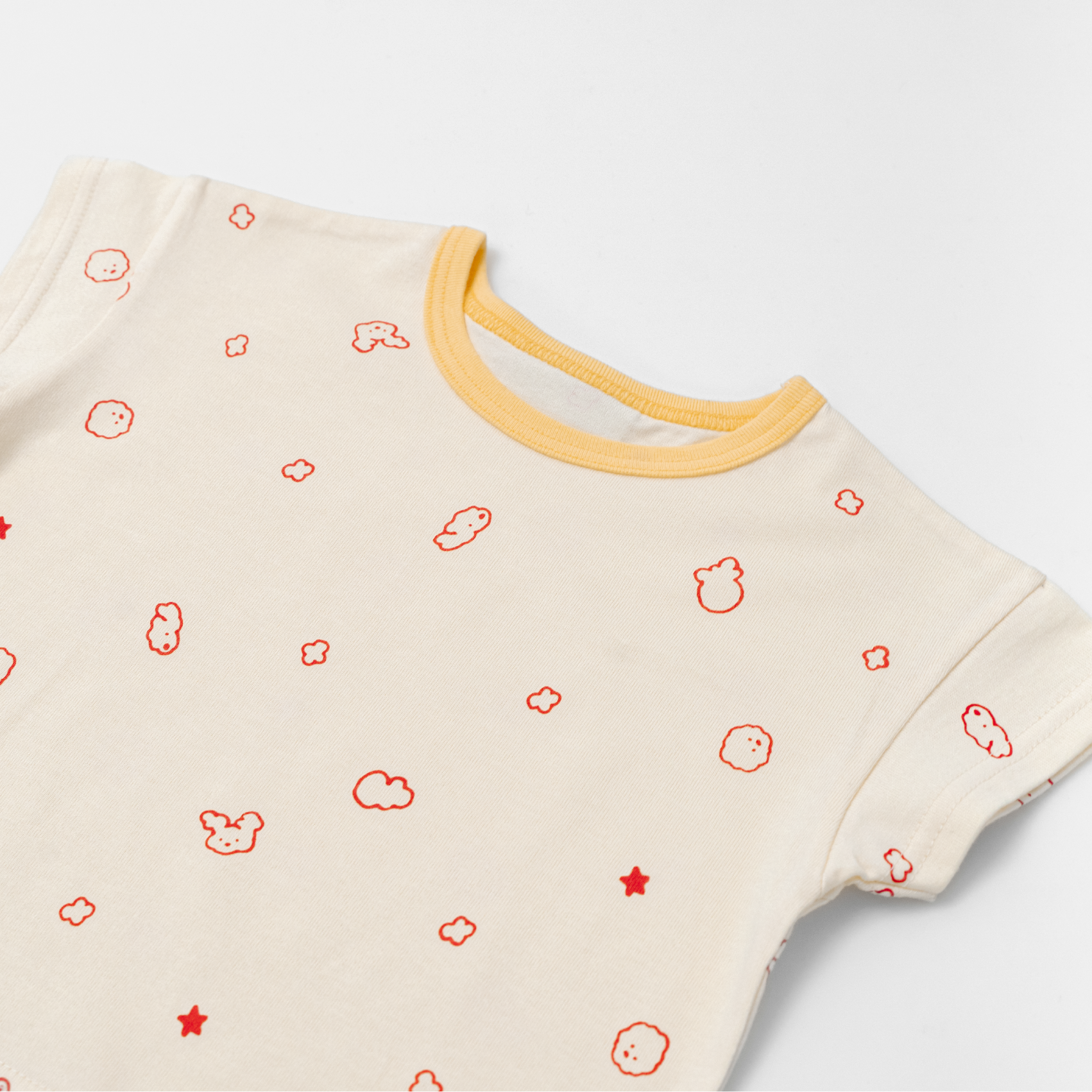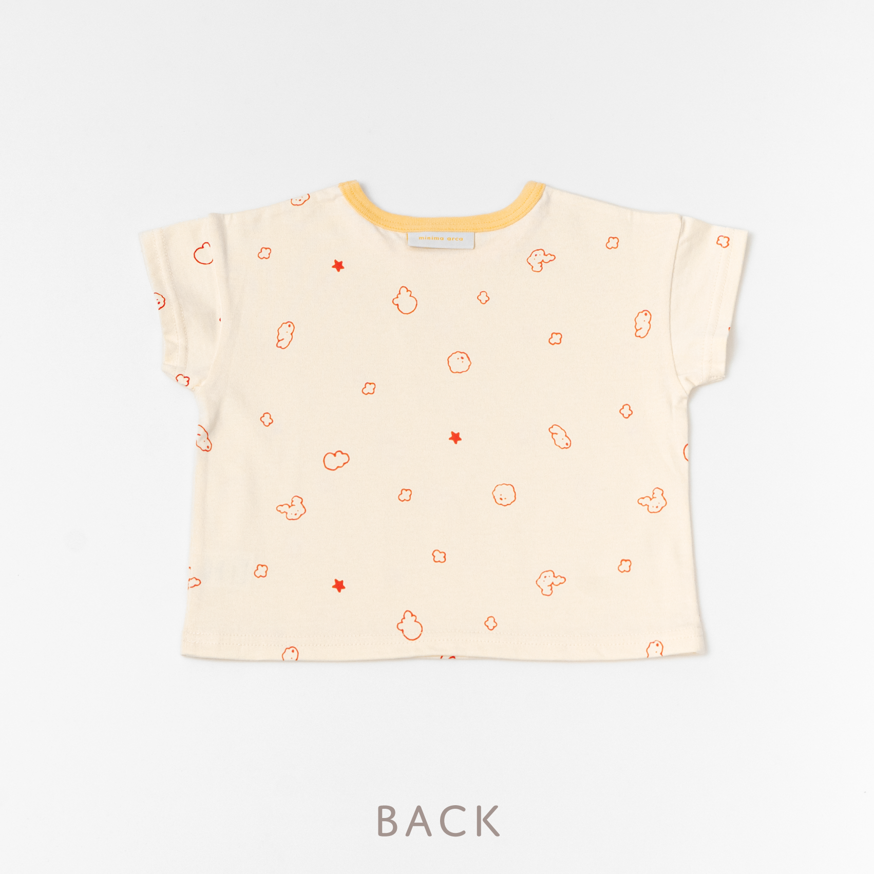 弾けるポップコーンモチーフの元気な印象のオリジナルプリント。ポップコーンの中に動物が紛れている遊び心のあるデザイン。
