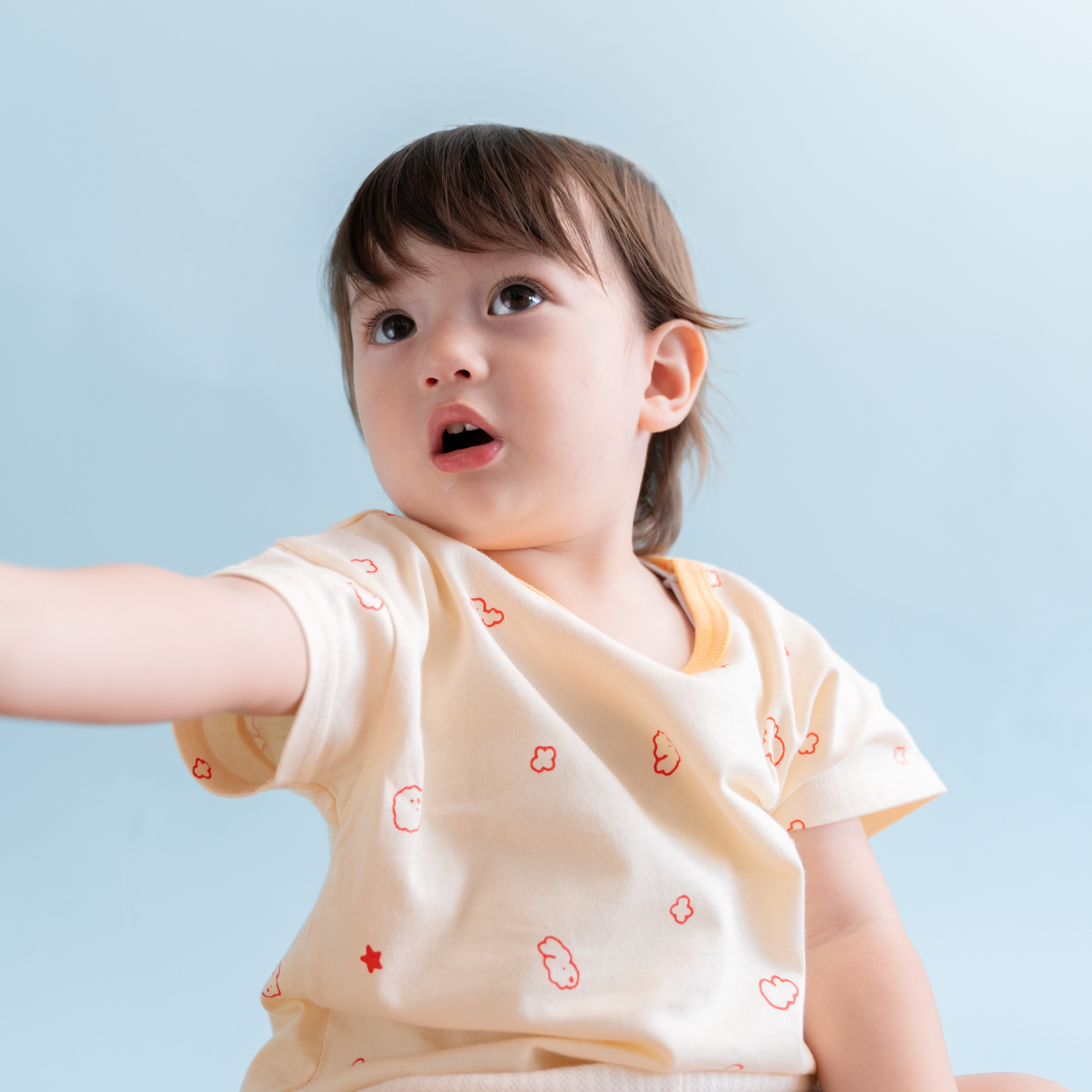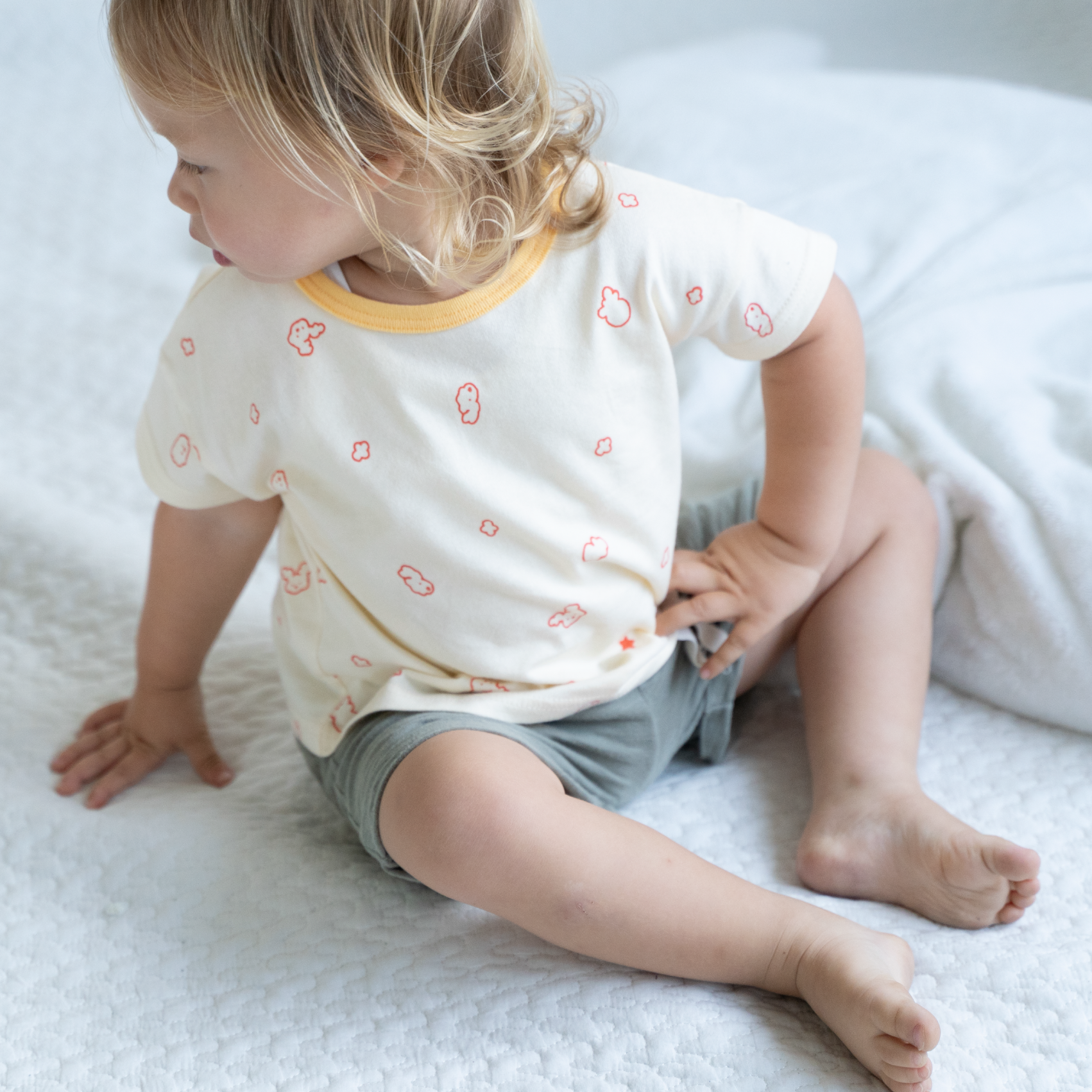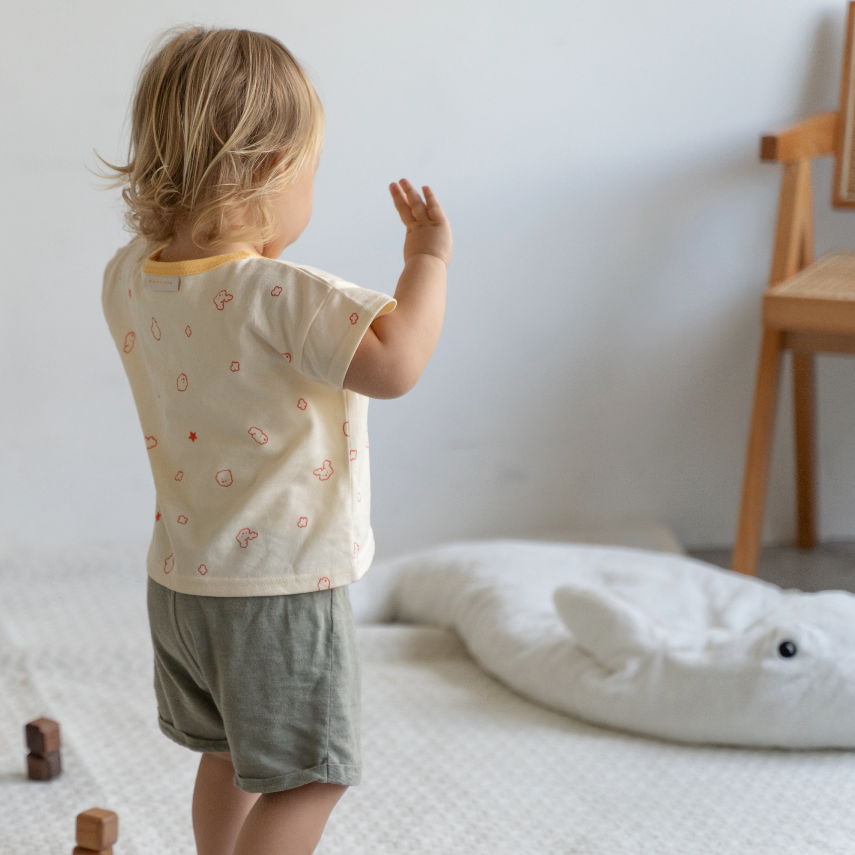 弾けるポップコーンモチーフの元気な印象のオリジナルプリント。ポップコーンの中に動物が紛れている遊び心のあるデザイン。